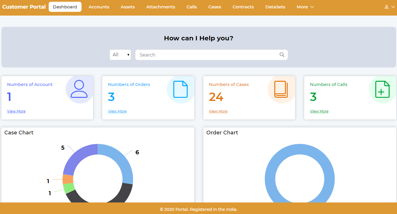 Here the user will get the Dashboard view as per the block configuration and page settings. Here the Counters and Charts are displayed as per the configuration in the Counters & Charts block.