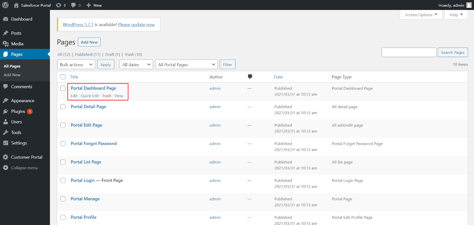 Login to the WordPress Backend. Now, navigate to the Customer Portal ➤ Manage Pages, you will land on the portal’s ‘Pages’ page.