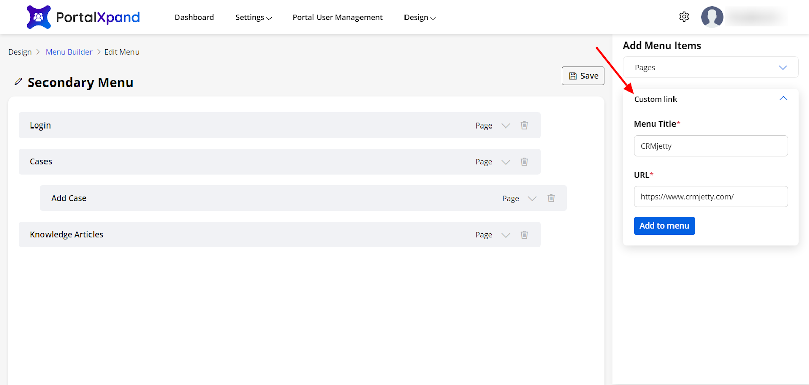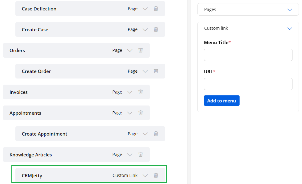 You can set external URLs from Pagebuilder in CRMJetty Portal using Custom Link in the Menu Builder. Go to Design ➤ Menu Builder ➤ Edit, you will land on the “Edit Menu” page.