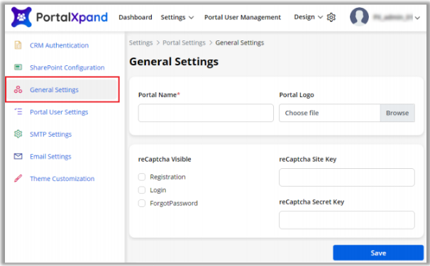 You can set your portal details under the General Settings. Here you can add reCaptcha details alongwith general details.