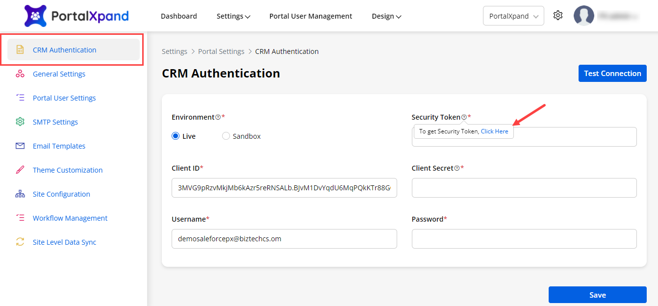 Navigate to Settings ➤ Portal Settings ➤ CRM Authentication, you will get the Security Token and Client Secret fields.