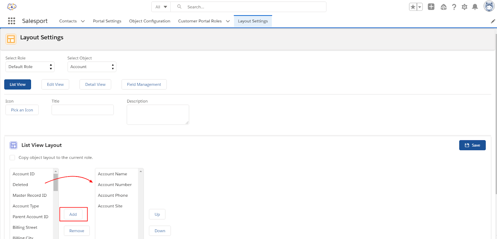 To add the new fields in the already listed fields go to App Launcher ➤ Salesport ➤ Layout Settings, you will land on the “Layout Settings” page.