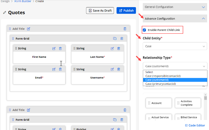 Once the new form is created, you will get the Enable Parent-Child Link under the Advanced Configuration.