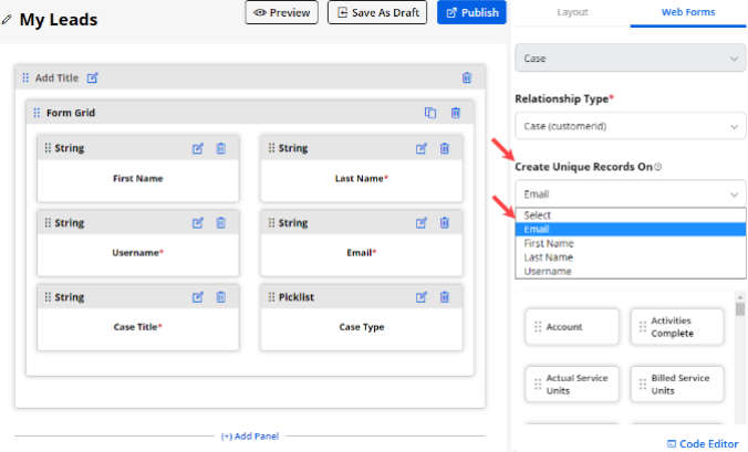 Create Unique Records On: Select the parent field on which you want to identify unique records and create an entry in CRM.
