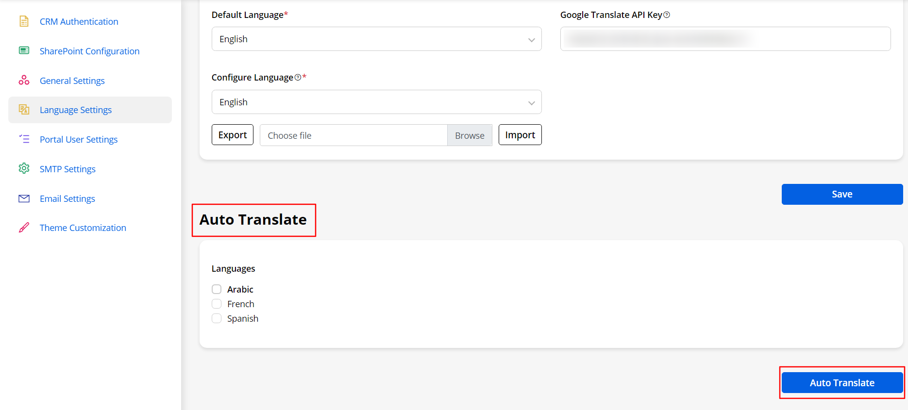 Auto translate feature lets you translate the portal labels. For Auto translation, you need a Google Translate API key. Here is how you can configure the key in your portal and move forward with the translation process.