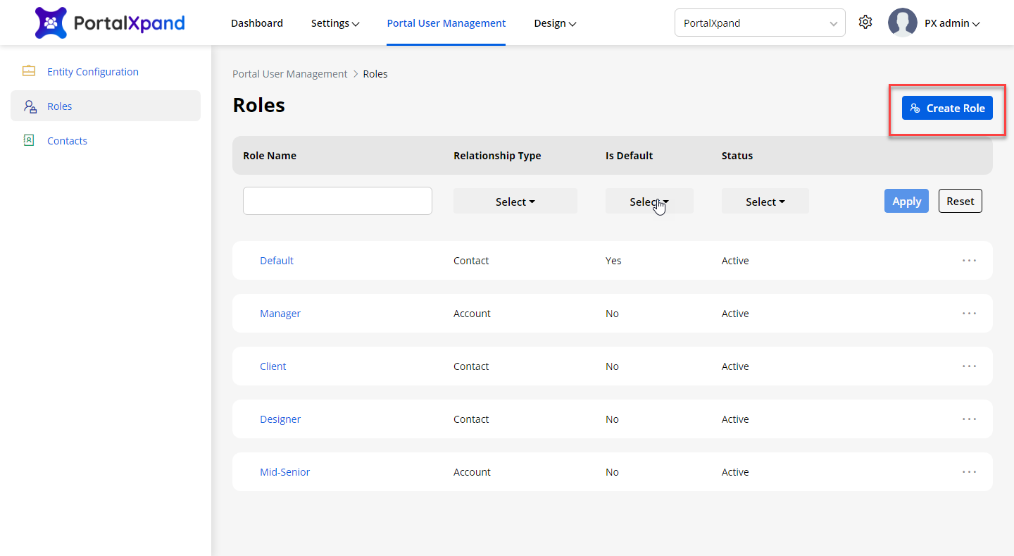 Navigate to the Portal User Management ➤ Roles, you will land on the Roles page. Now click on the Create Role button to enable an account-based hierarchy for the portal user.