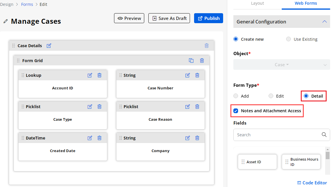 If you are designing the ‘Detail’ form of any object, you can enable the notes with attachments for the detail form of any object in the customer portal. By clicking on the “Detail” form type, you will see the Notes and Attachment Access checkbox.