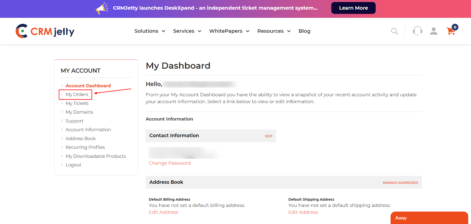 Viewing the order history is quite simple. As you go to www.crmjetty.com and log into your CRMJetty account, you can see the Account Dashboard on the home page. On the left, you can see the “My Account” section. In that section various options are available. As you click on the “My Orders” option, a tab will appear showing all your orders. It will include your recently placed orders and your order history altogether.