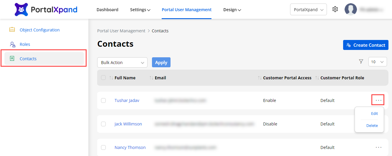 Navigate to Portal User Management ➤ Contacts, you will get the list of the Contacts.