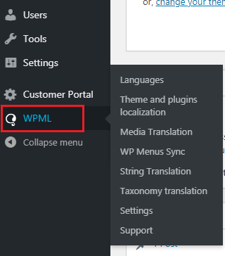Once you installed & activated the required plugins for WPML, you will get the WPML option in the WordPress navigation pane.