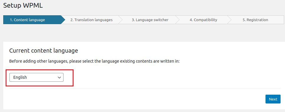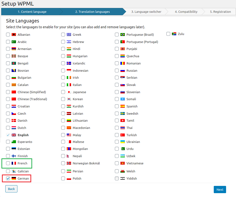 Translation Languages: On the next screen, select the languages that you want to enable for the customer portal. Select the languages from the list that you want to add to the customer portal and click on the “Next” button to set up WPML.