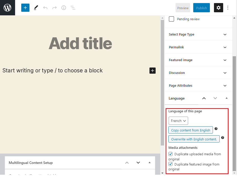 Now by clicking on the + add an icon, you will navigate to a new page from where you can add the new page of the Language and duplicate the content. You need to configure the below options under the “Language of this page”: