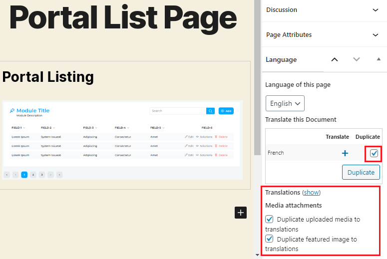 ‘Tick’ the check box of the Duplicate for the “French” Language and ‘tick’ the media options to translate.