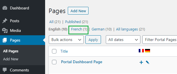 After setting up the WPML Languages setup, navigate to the Pages to translate the content of the portal page. You can see the list of portal pages. Translate all the language-specific pages by adding a new page or duplicating the page.