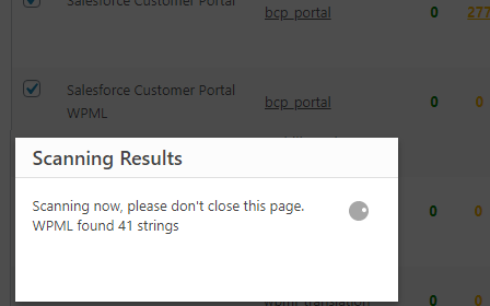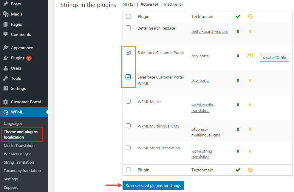 Select the required plugins to get the strings under the “Strings in the plugins” section. You need to select the Salesforce Customer Portal plugins and click on the Scan selected plugins for string button.