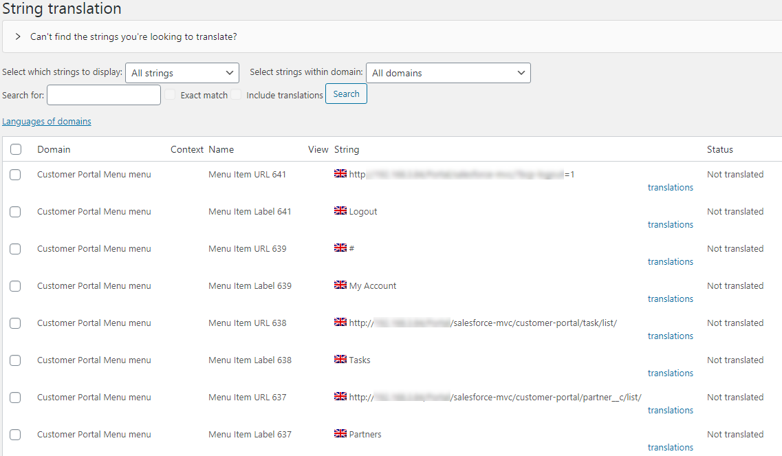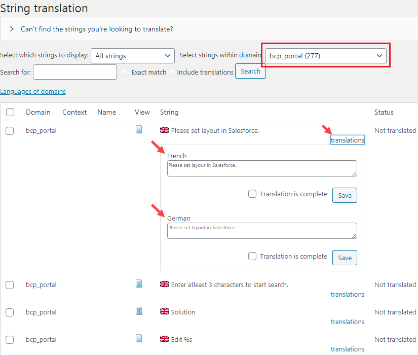 You need to select the domain for which you want to translate the strings. You can also search & filter the specific strings.