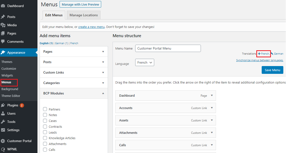 You can translate the WP Customer portal menu and customize the language-specific menu. You can translate the manus in two ways: