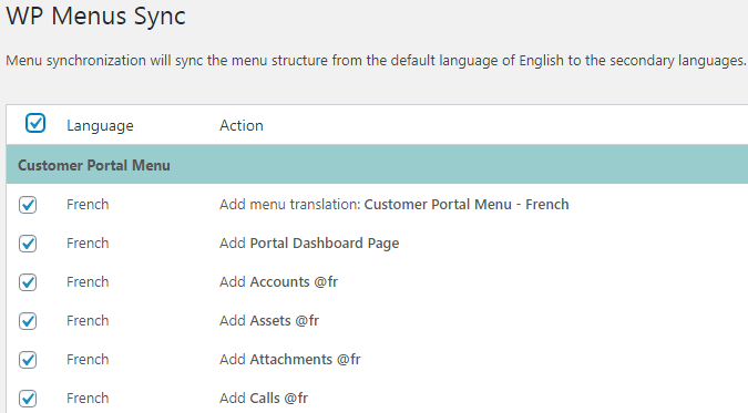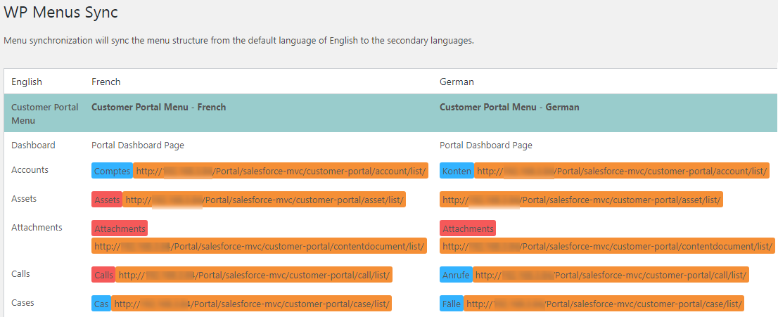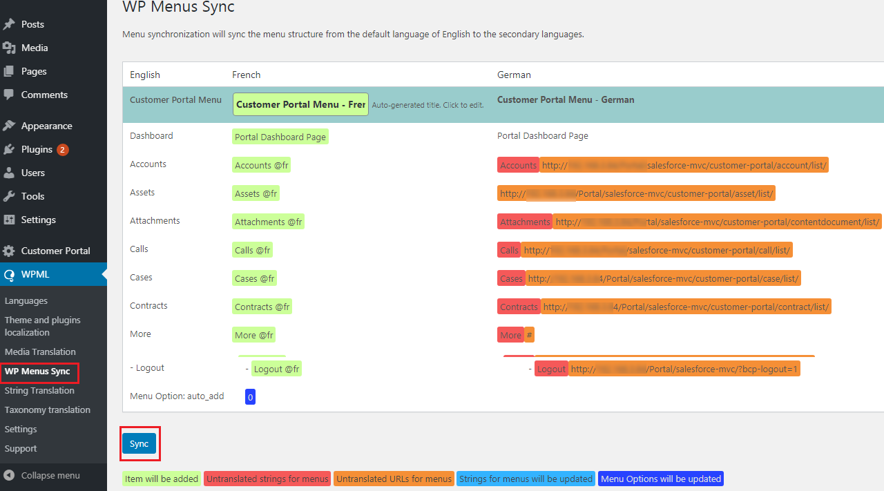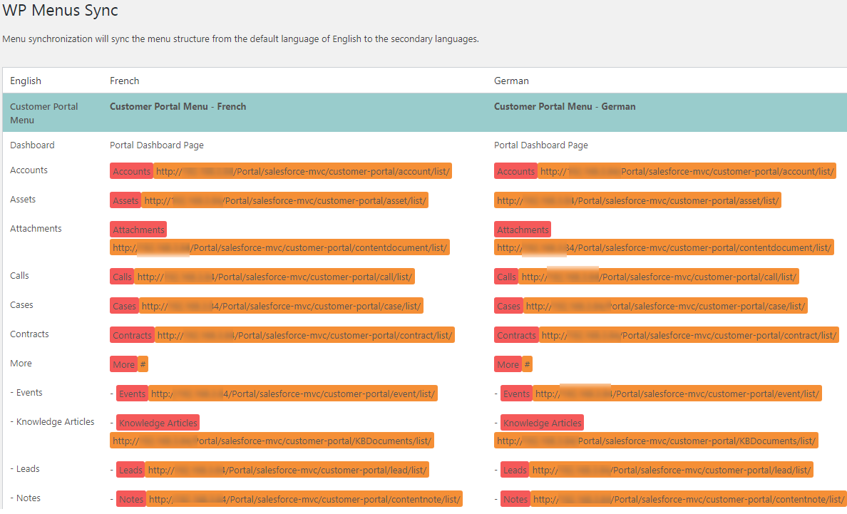 From here, you can manage the translation of the Salesforce content and sync the menu of the Salesforce Customer Portal.
