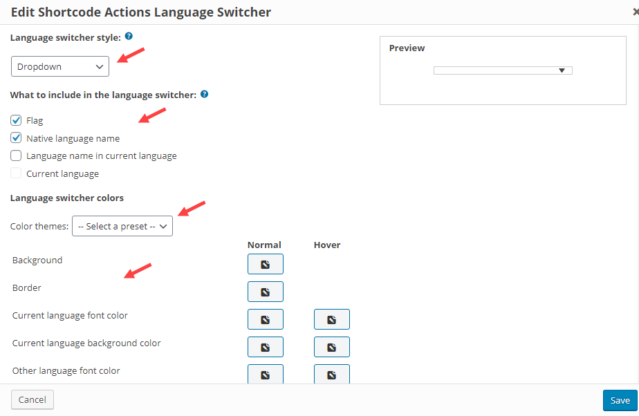 – What to include in the language switcher: Include a Flag, Native lang. name, Lang. name in the current language.