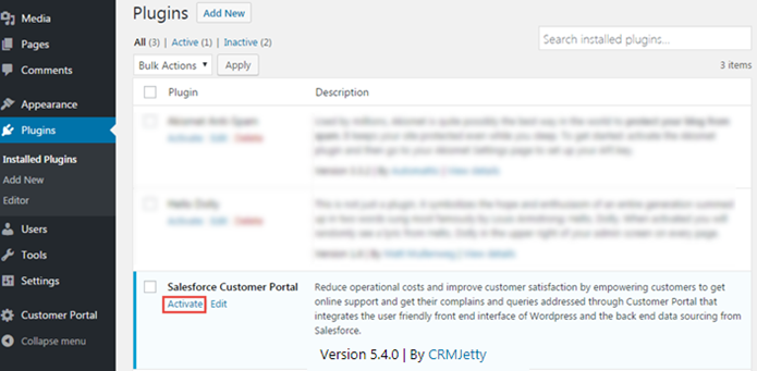 Click on the ‘Install Now’ button to install the plug-in. After installation, you can see the “Salesforce Customer Portal” plugin was successfully installed. But still, it’s Inactive.