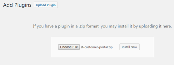 Click on the ‘Add New’ button which will redirect you to the ‘Add Plugins’ Page. Click on the ‘Upload Plugin’ button. Browse the ‘sf-customer-portal’ zip and Install the Plugin.