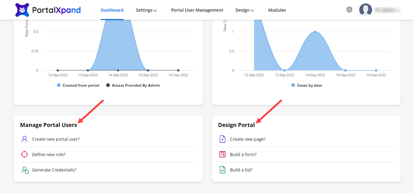 You will find the “quick links” for Manage Customers & Design Portal to perform quick actions from the Dashboard. [3]