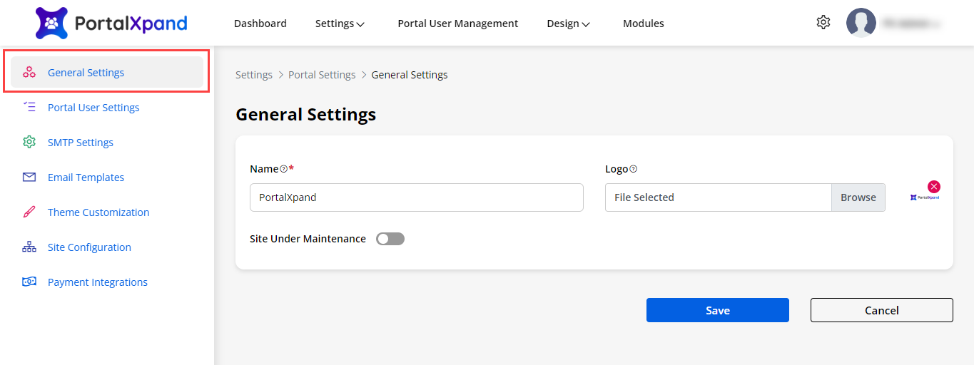 Navigate to the Settings → Portal Settings to set up your portal details. Also, from the ‘gear’ icon, you can navigate to the General Settings. [1]