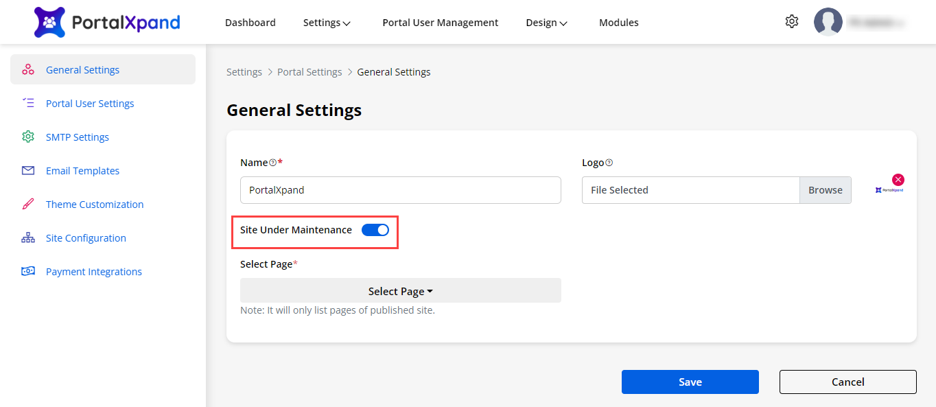 Admins also have an option to display the site under the maintenance page if your site is under maintenance. Enable the Site Under Maintenance switch and select the page you want to display when your site is not working so that your users are not able to access the portal. [2]