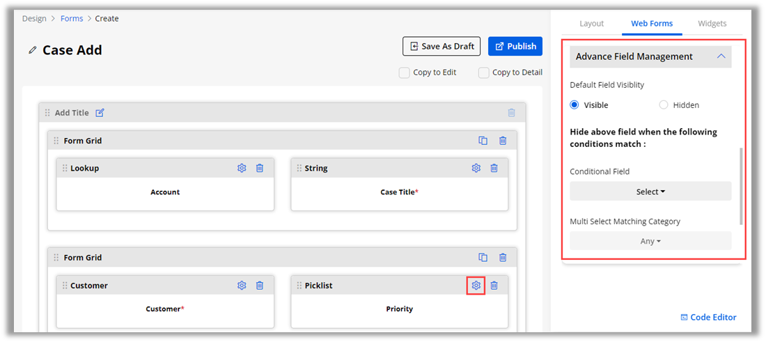 When the portal users select a ‘Field’, which is set as Conditional Field Options, the fields which are selected in “Visibility Field” will appear in add/edit of any module form. [2]