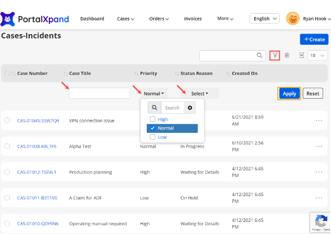 Portal users can also filter the records, if you have enabled the advanced filter from the list view of the Data Card widget.