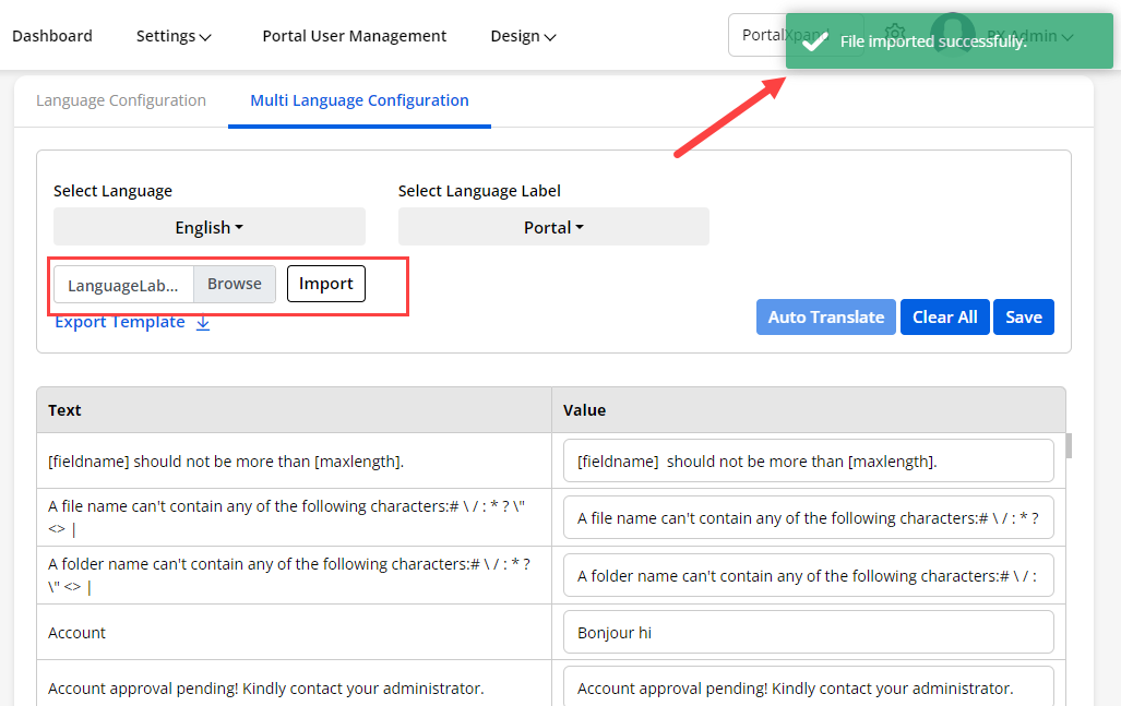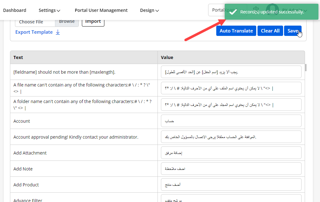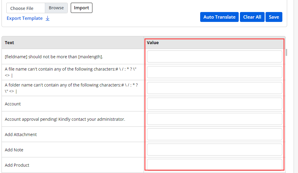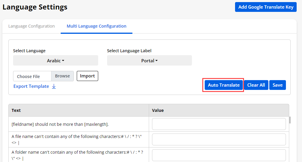 You can also add the translated text by importing the file. First you need to click on the Export Template button. The template file will be downloaded into your system. [7] [8]