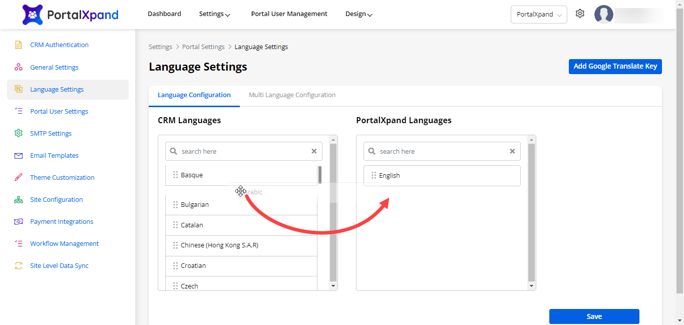 You can enable any language in the portal by dragging and dropping the language from the CRM Languages to the CRMJetty Portal Languages. [2]