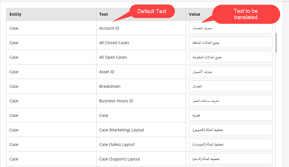 - On the right side you will get the value tab. You can insert the translated value of the default text on the left side.