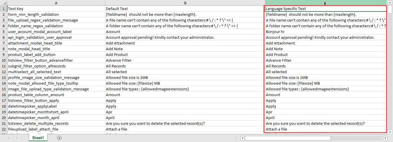 The template file will have the information like Text Key, Default Text, and Language Specific Text. You have to add the translated text in the Language Specific Text column.