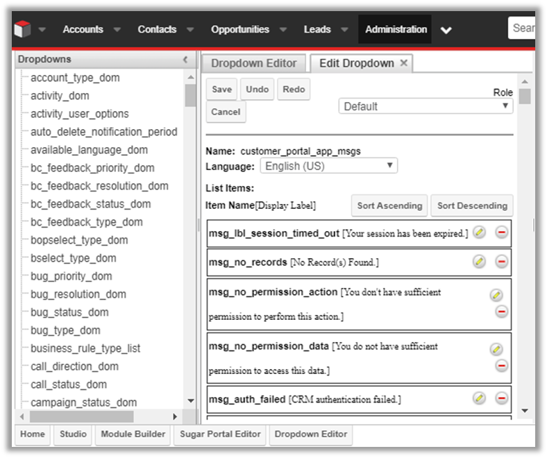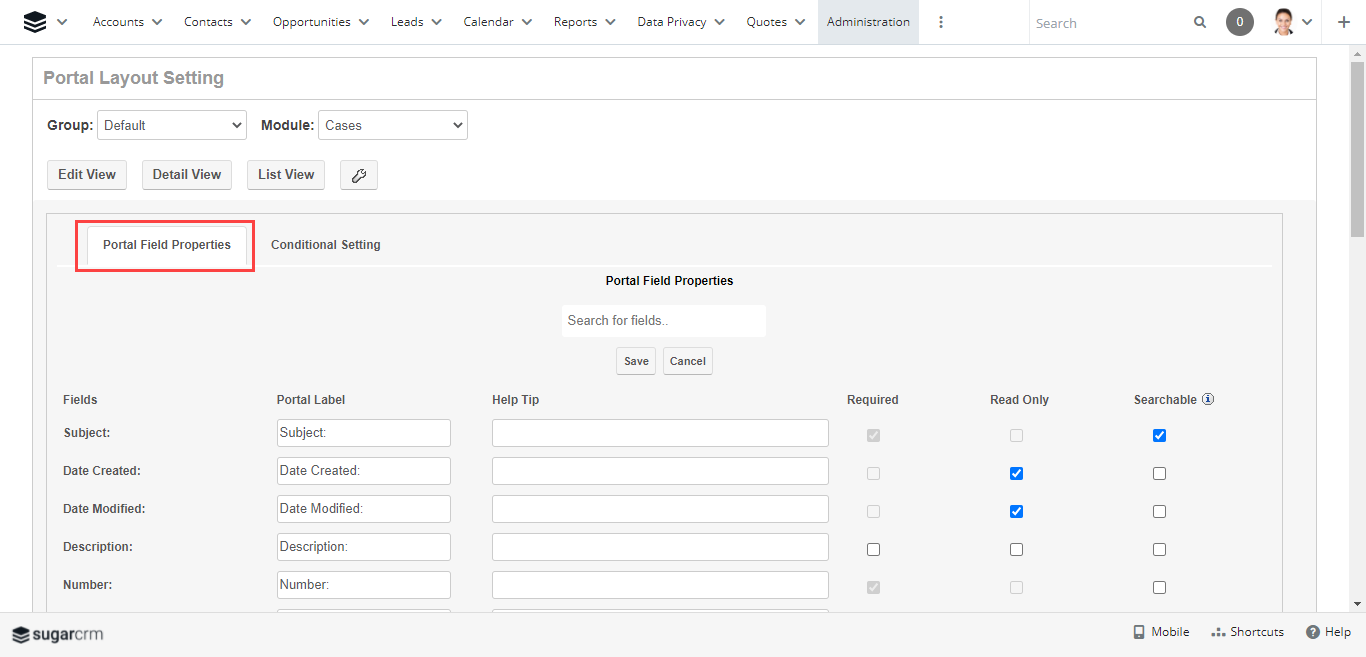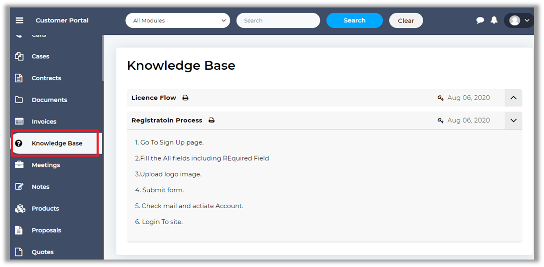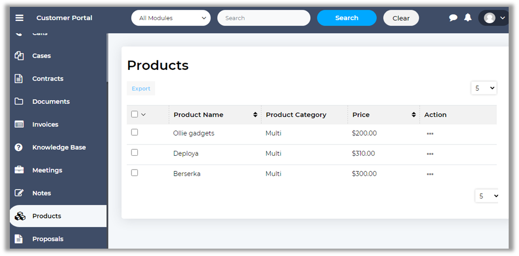 Customer portal provides feature to manage SugarCRM Module’s configuration for their portal users. You can decide and configure default SugarCRM modules as well as custom modules accessibility.