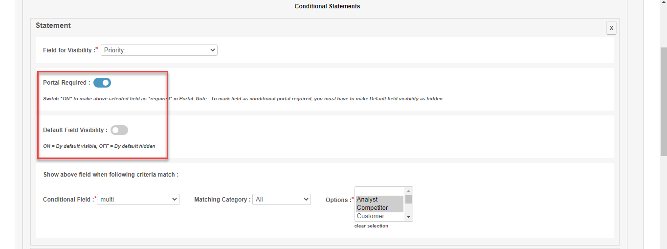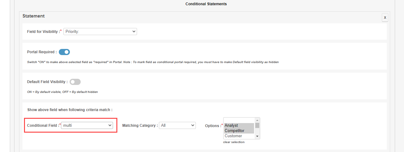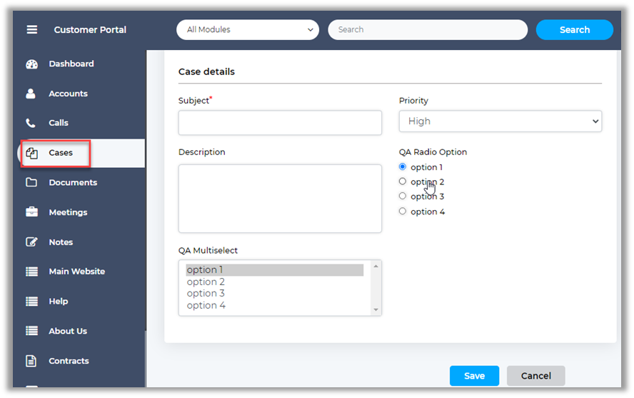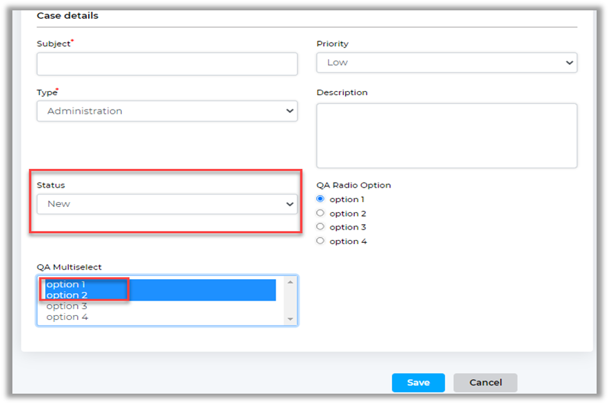 I.e. By selecting the “option 1” from the QA Radio Option, the portal users will get the QA Multiselect field.