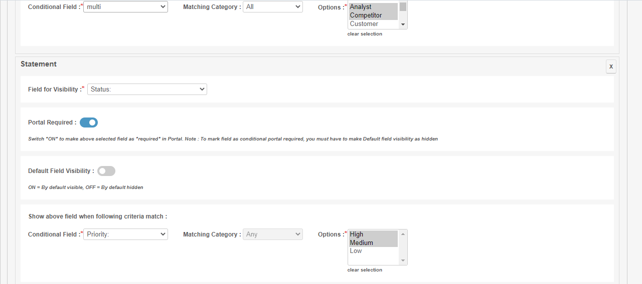 QA Multiselect: If the portal users select the “Option 1” and “Option 2”, so based on the “And” condition, the Status field will appear after the “Description” field. [3]