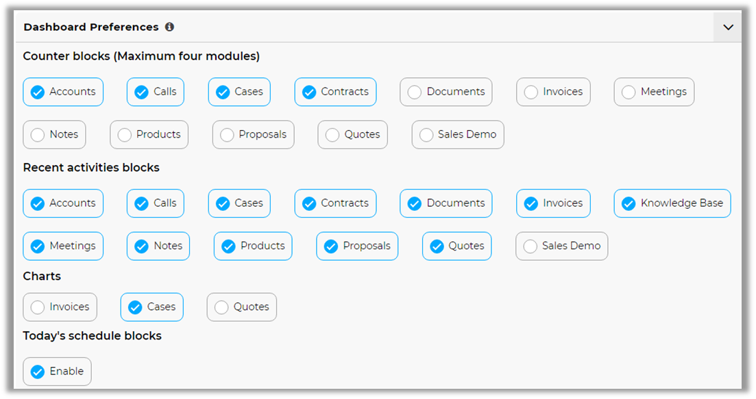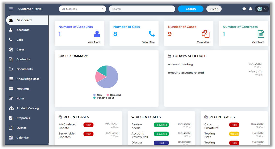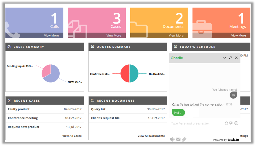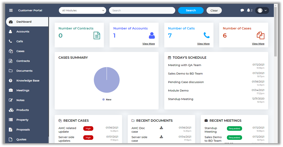 Quickly access top modules by clicking “View More”. It will also display charts for cases and quotes module to view their status.