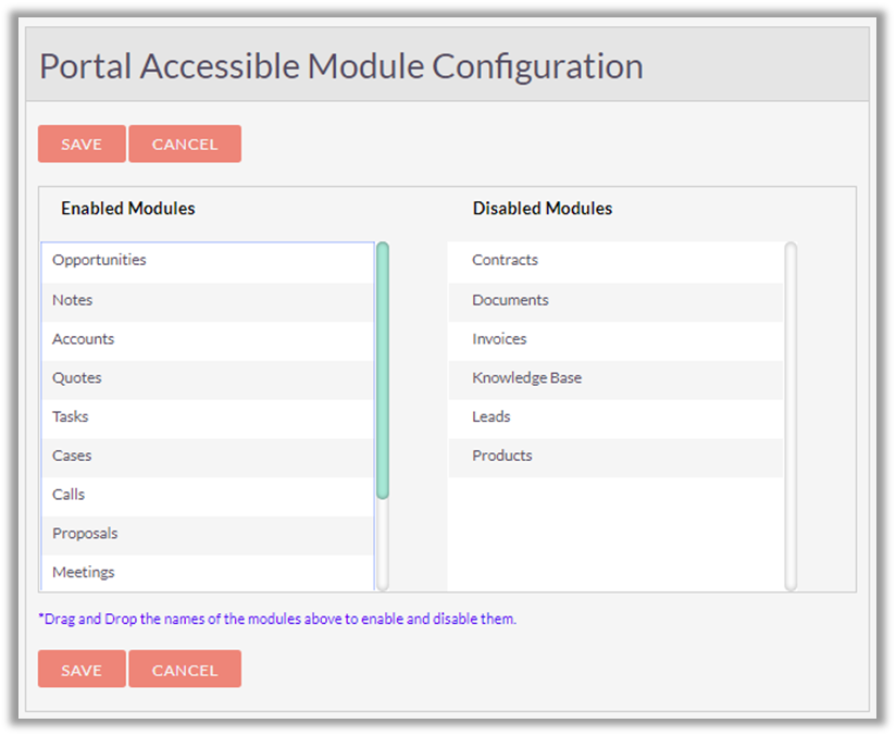 You will get the list of default and custom module. Just need to drag and drop to make them enabled for portal users.