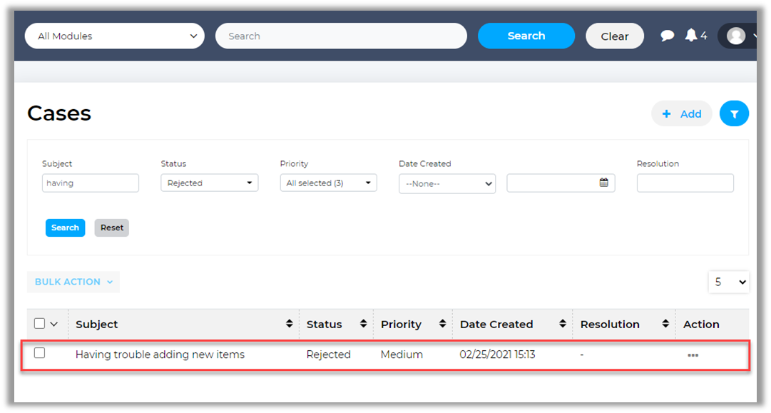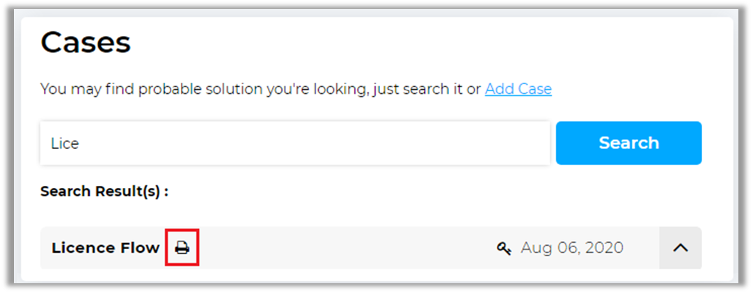 After clicking on the + Add button, your customer can find the probable solution by searching the query/issue. The search result will appear as per inserting the search key word.