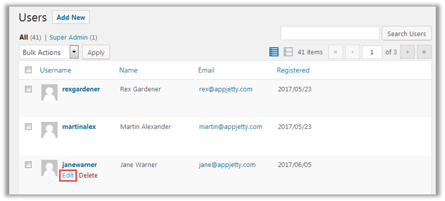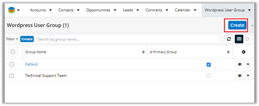 Click on ‘Customer Portal User Group’ link and you will be redirected to the WordPress User Group Module’s List View. Here, you can see ‘Default’ WordPress User Group already exist in the list. User cannot delete this ‘Default’ group record.