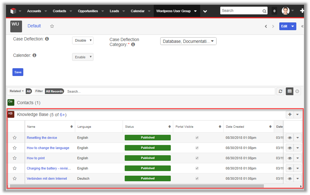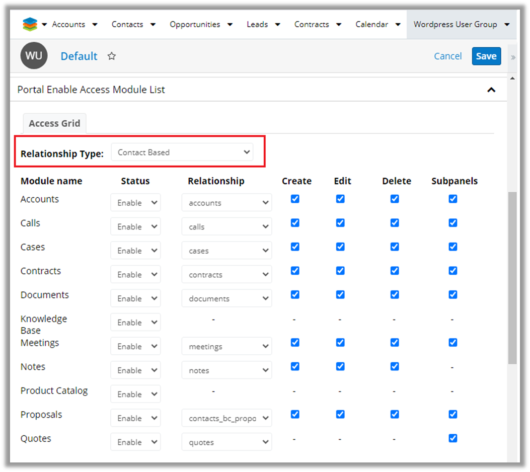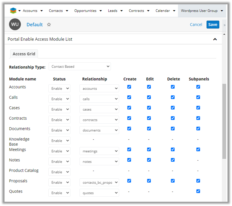 Customer Portal provides feature to manage SugarCRM Module’s accessibility for their WordPress portal users. You can decide access of which module should be provided to which customer by WordPress User Group module.