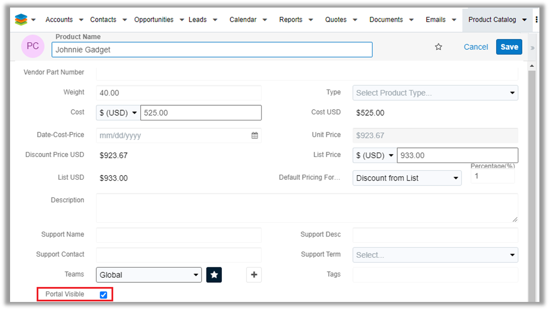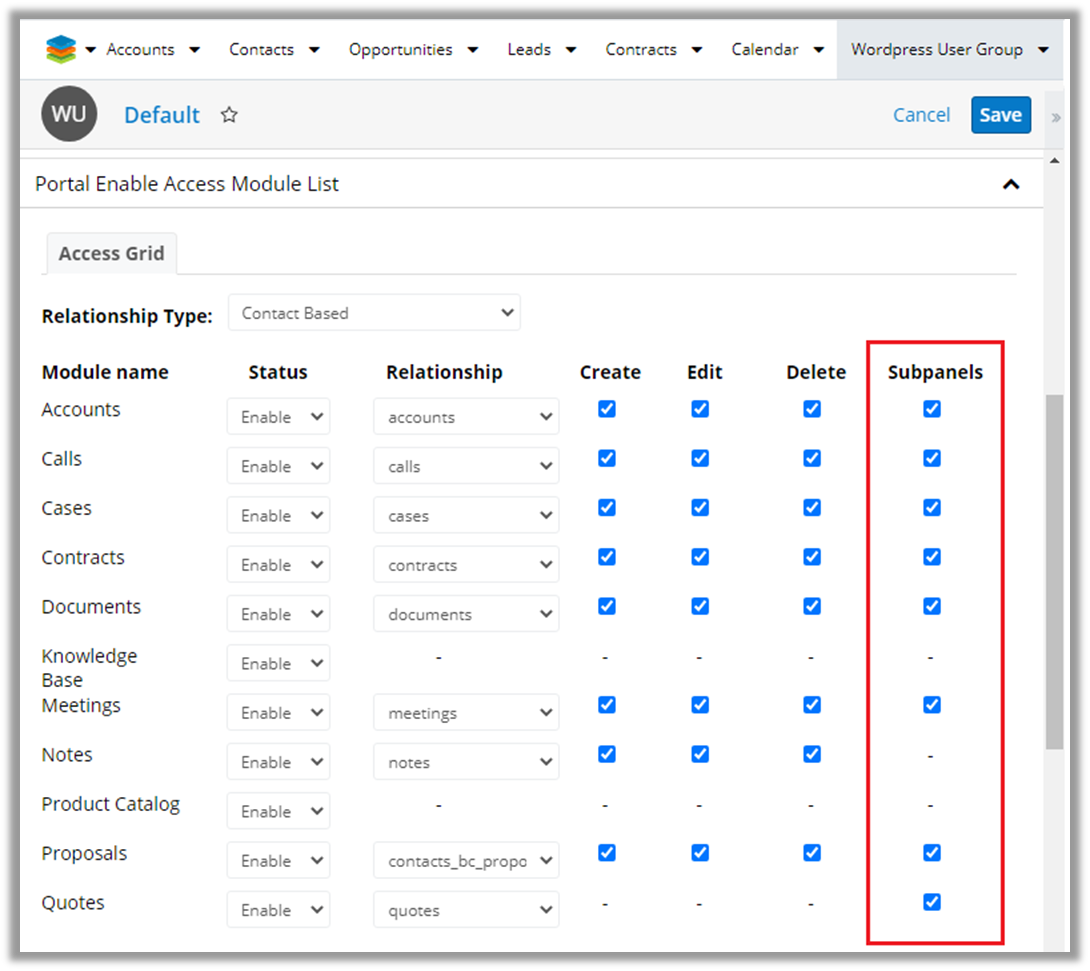 You will get a list of Portal enabled modules. Check the last box provided for sub-panel’s visibility in portal.