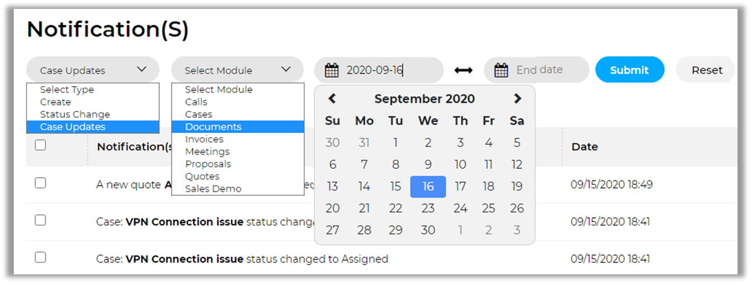 Start Date and End Date: Choose dates to view in between notifications for that particular day, week, month or year.
