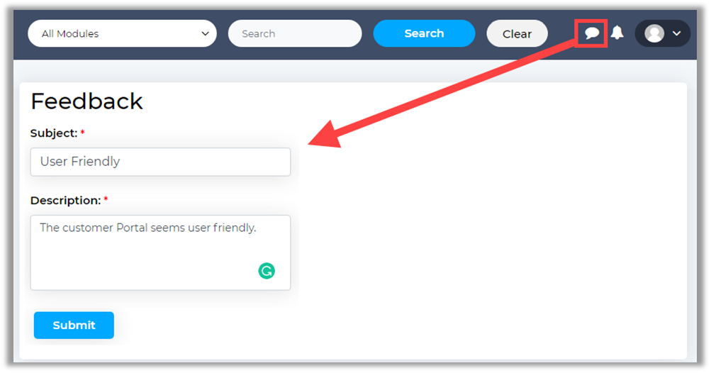 Add subject and description for feedback and save. It will get related to this particular contact in CRM. So, in contacts you will get sub-panel of feedback where there will be a list of feedbacks added by that portal user.