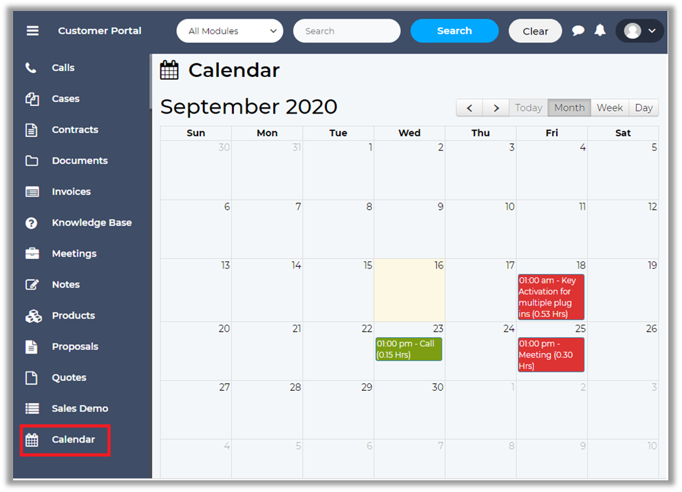 If you have enabled the Calendar option from the SugarCRM Configuration, the Calendar will be displayed to your portal users.