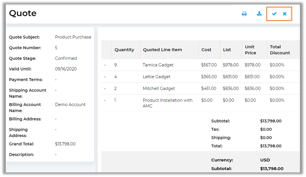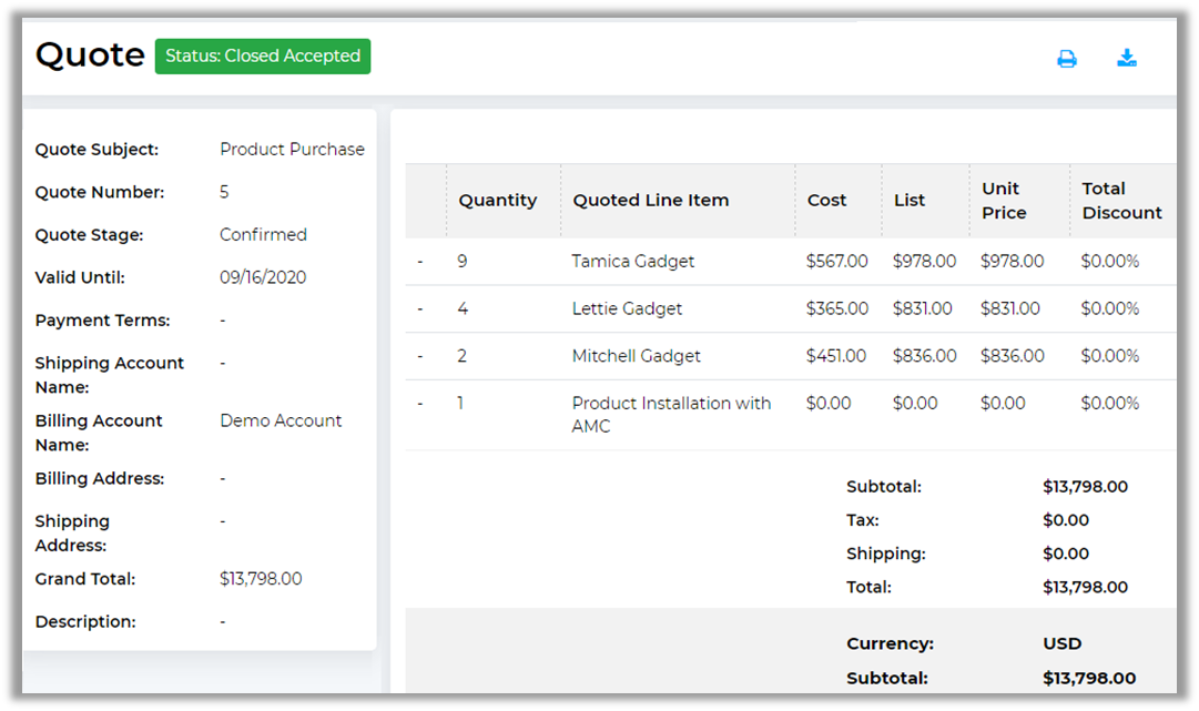 If the user ‘Accepts’ the Quote, the status will be updated to “Closed Accepted”. [2]