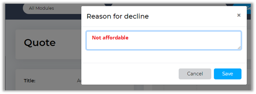 Similarly, you can also see the Status in your SugarCRM portal as Closed Accepted and Converted. But if the customer declines the ‘Quote’, they must add a Reason for Decline. [4] The status in ‘Quote’ will be updated as Closed Lost.