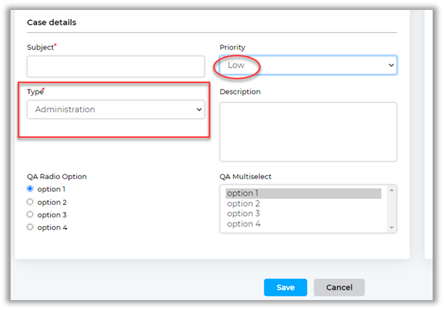 If the customer has selected the “Low” priority, then the Type field will appear while adding the case as per the conditional statements from the Conditional Settings. [2]