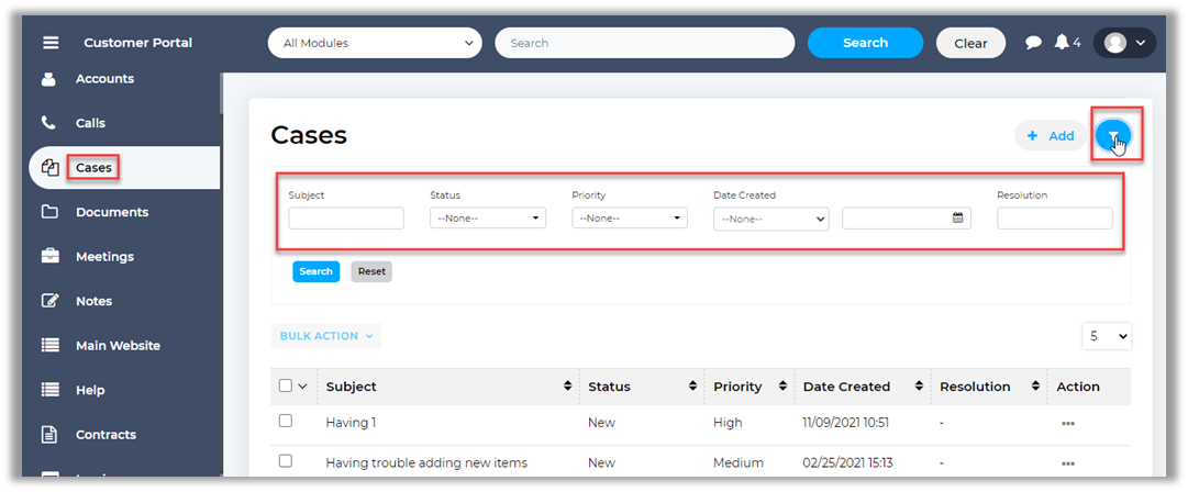 The portal users can search and filter the module records from the list. By clicking on the ‘filter’ icon, you will see the “Search” & “Filter” options. [1]